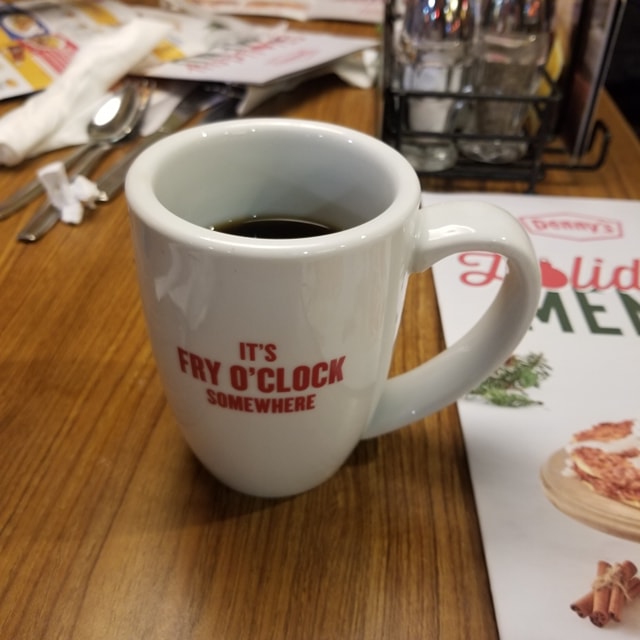 First item on the menu for review was Denny’s coffee. We were offered a beverage while we waited due to the understaffing calamity. Denny’s brand of coffee has a tart picante flavor matched with a punk rock dining room mosh pit serving of pungent aroma that set holiday anxiety at ease. The Denny’s blend combined with their coffee cups soothed relentless customers with a porcelain kiss delight. Denny’s coffee cups are uniquely thick unlike most coffee and java hash brown joints.