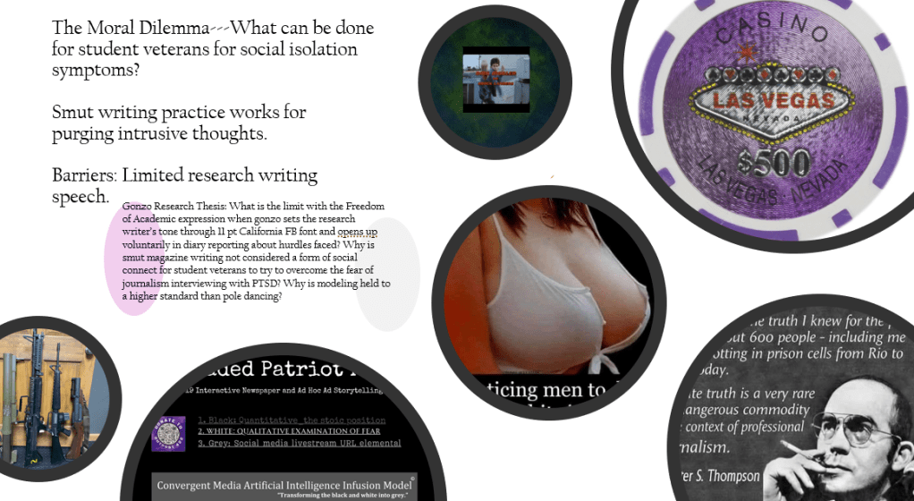 Gentlemen’s clubs are a part of military culture and as long as student veterans use their G.I. Bill, no institution should restrict them from finding a research writing outlet to manage their symptoms through gonzo research at Gonzo-19—the Center for Gonzo Journalism at the University of Wisconsin-Whitewater through the author’s gonzo independent study.